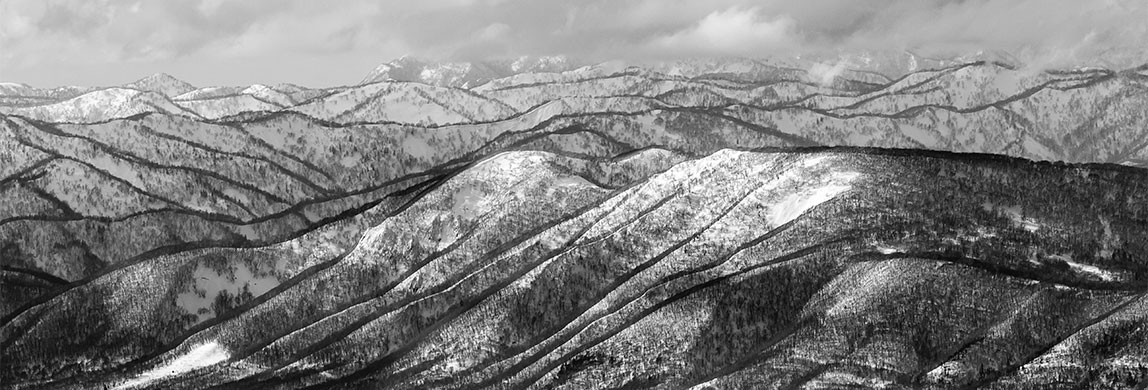 静かにうねる山々が、水墨画のように非現実的に横たわる。